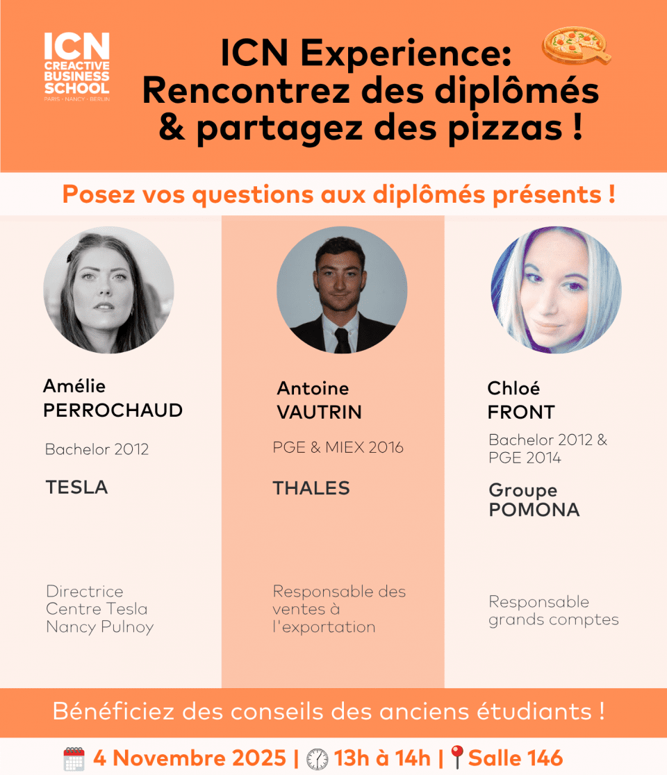 Votre école vous invite aux prochaines sessions ICN Experience pour échanger avec des diplômés et découvrir des parcours inspirants via des partages d’expériences. Une belle opportunité pour élargir vos horizons professionnels et développer votre réseau.